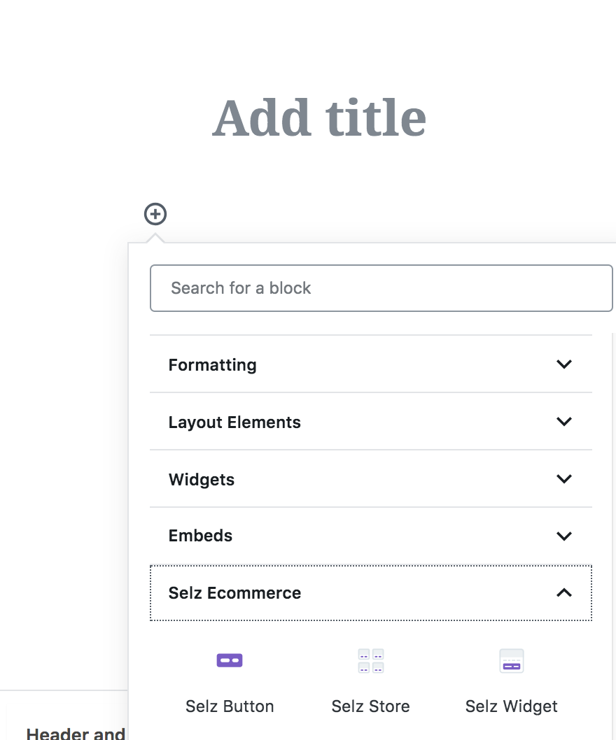 - Now that your Selz account is connected to the WordPress plugin, you can add product embeds to posts or pages throughout your site with the Selz Ecommerce content blocks by clicking the '+' and scrolling down to the Selz section. Keep reading for the detailed steps