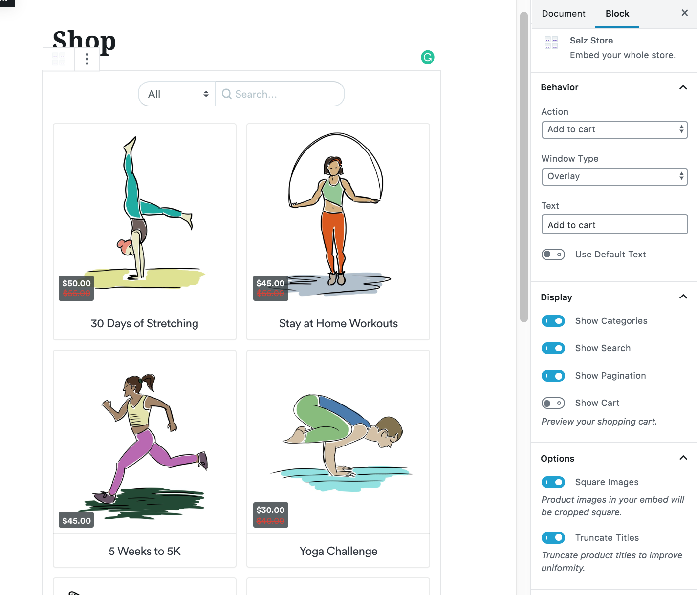 - Add an entire store to your site by clicking 'Selz Store' in your content block dropdown on a page or post within your WordPress account