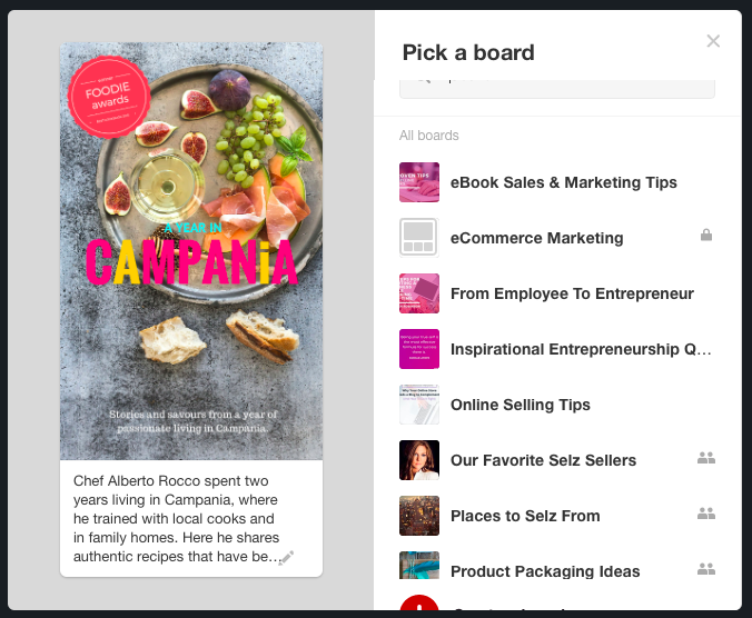 Last, but not least, choose your board and your pin will now be live on Pinterest, linking back to your store.