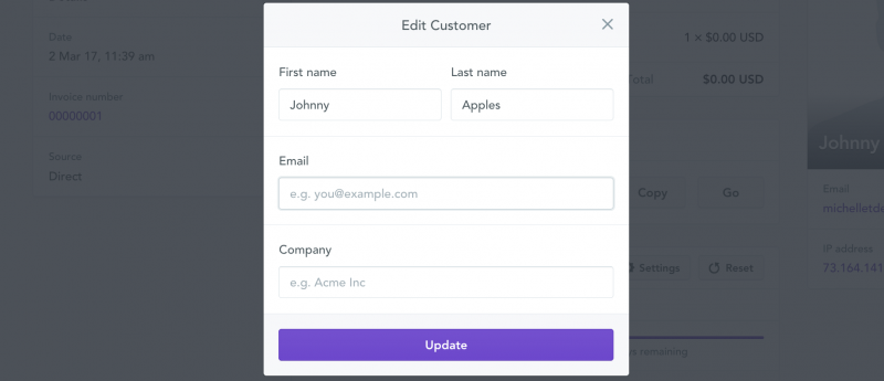 - Adjust the customer information as needed for the order and click Update.