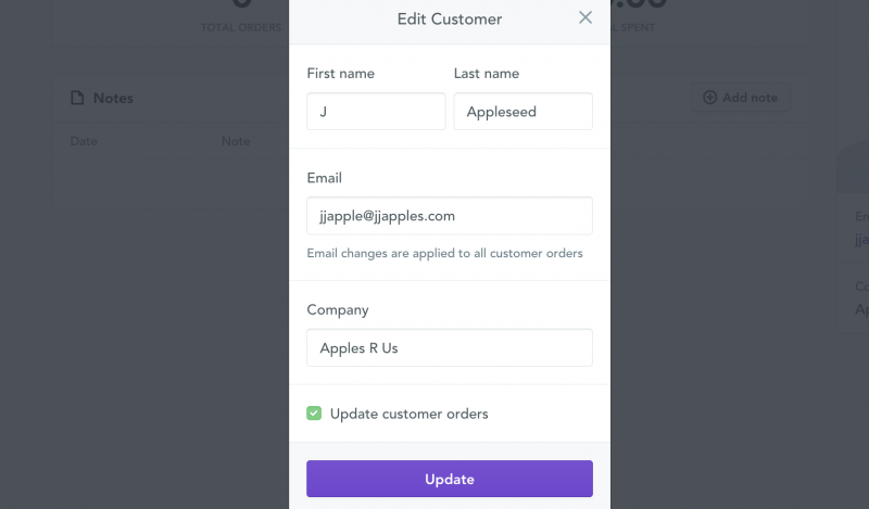 - Lastly, click the checkbox at the bottom to Update customer orders if you want to update all previous orders for this customer with the new information