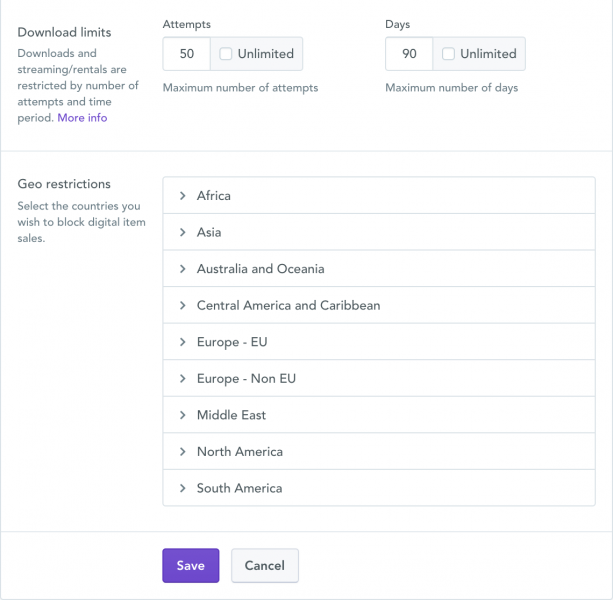 - Log into your Selz account, then click on Settings > Digital and select the countries or zones you wish to block. Once set up, this will stop someone from the restricted location from being able to purchase your products.