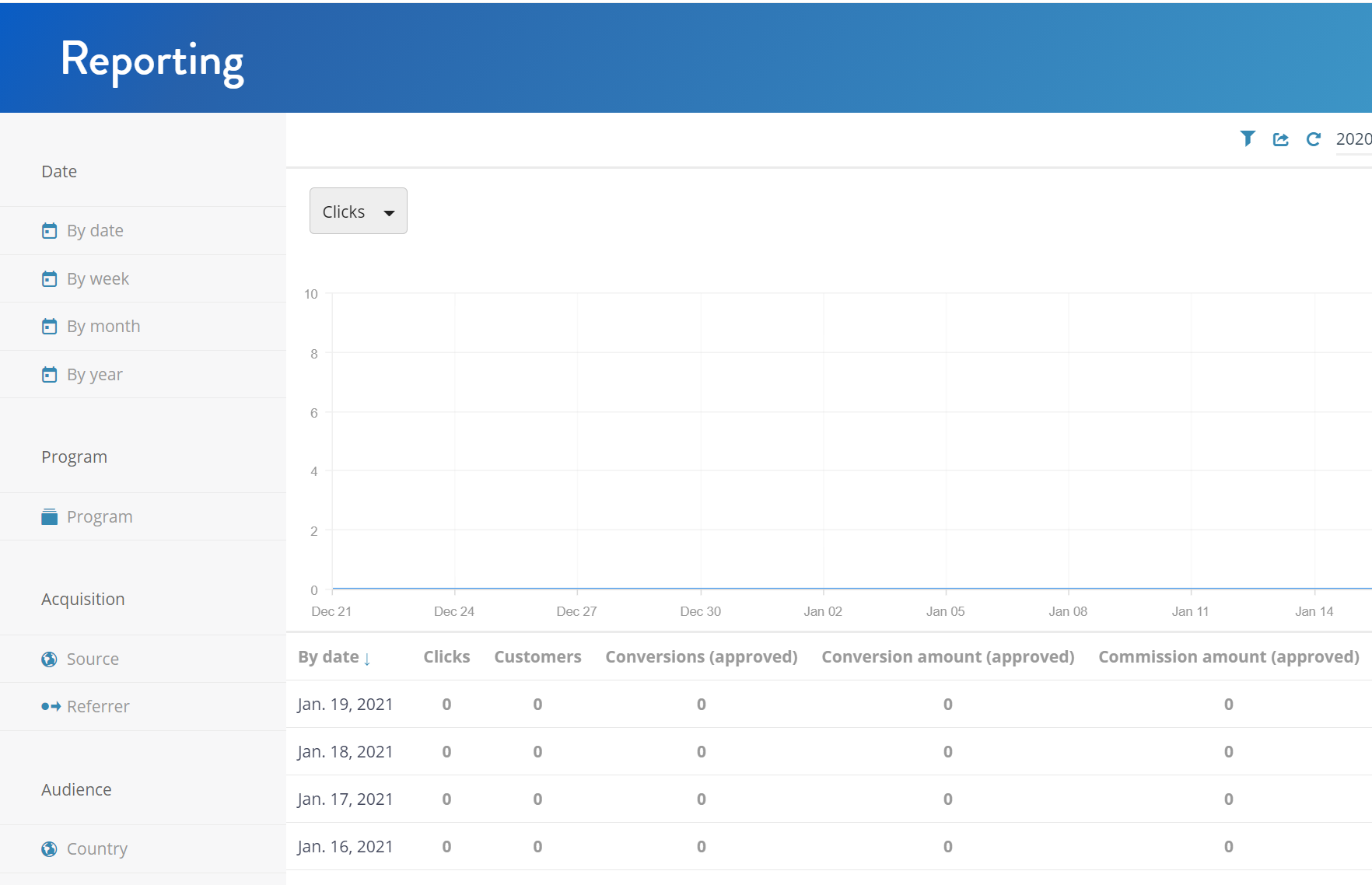 The important metrics on this screen are Clicks, Conversions, Conversion Amount, and Commission Amount. The Customers metric will not apply to your Affiliate work.