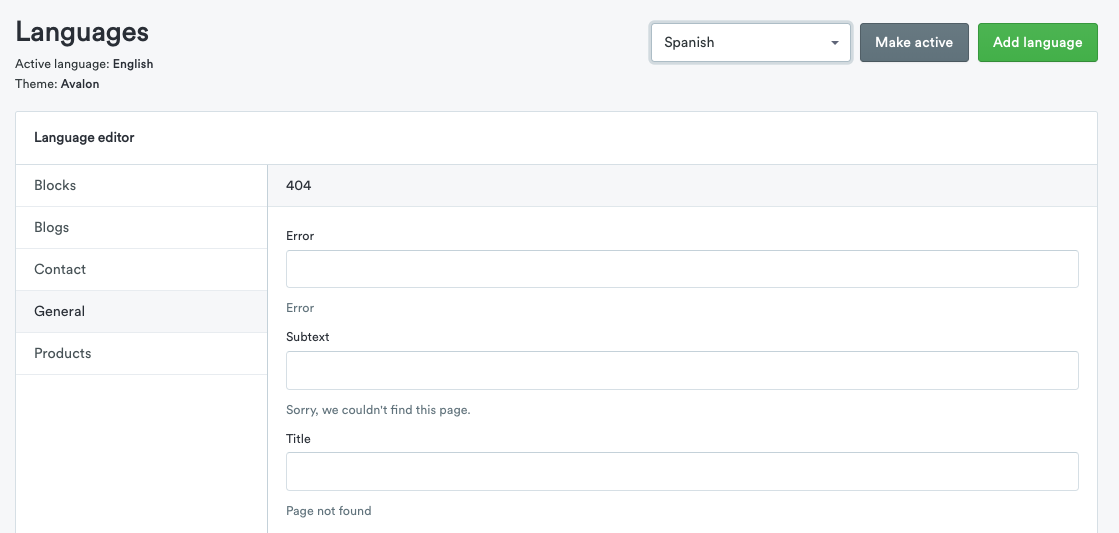 Now within the Language Editor, you can make changes to the labels and text used throughout your online store. Please note that any changes you make here are specific to your published theme.