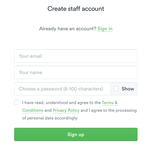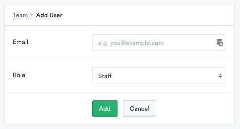 - Invite the staff member by entering their email address and set their role as either staff or admin. The staff member will receive an email invitation to sign up.