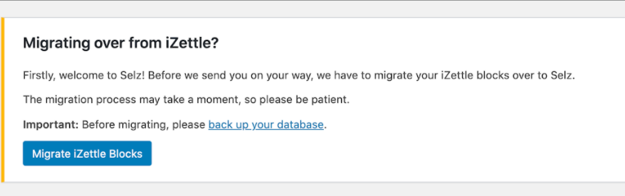 5. Once the plugin has been activated, you'll be prompted to Migrate. Click Migrate iZettle Blocks.