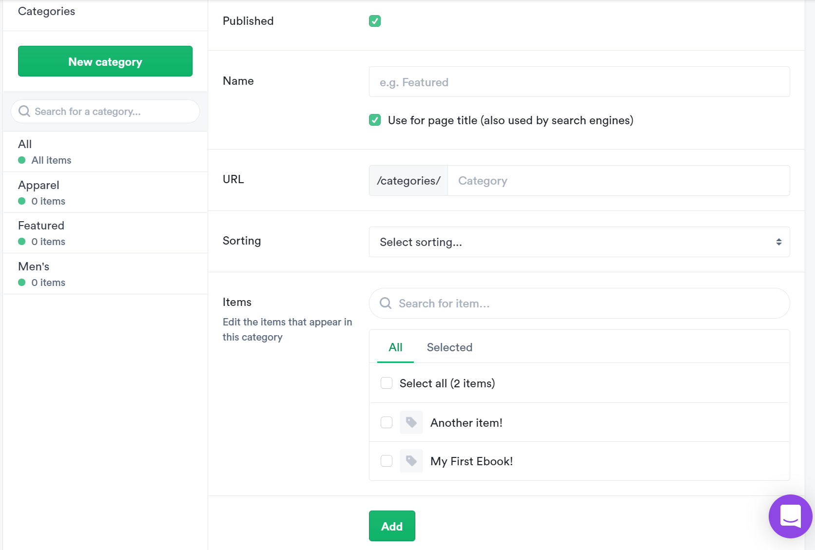 - Select the products you want to include in the category using the checkboxes in the Items section and click Add